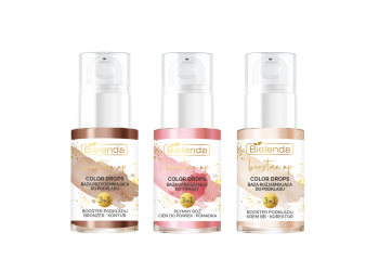 Linia Bielenda Boost Me Up Color Drops składa się z trzech produktów: przyciemniającej bazy do podkładu 3w1, rozjaśniającej bazy do podkładu 3w1 oraz bazy upiększającej do twarzy 3w1. Każda z nich skutecznie pomaga uzyskać idealnie dopasowany kolor podkładu, nawilża i pielęgnuje zdrowy i piękny wygląd skóry.